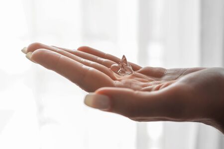 Vitamin D or omega 3 capsules. Vitamin gel in hand against the window. The concept of a lack of vitamin D in the body