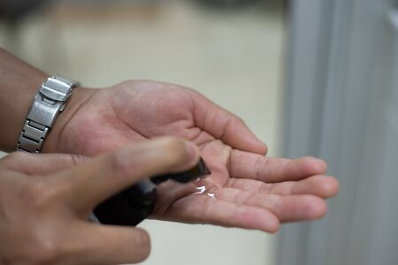 Selective focus of Asian men hand using Alcohol gel, hand sanitizer for personal hygiene on white background to protect, prevent from virus and illness during Corona virus outbreak or Covid 2019.