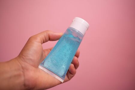 Close up hand holding alcohol gel bottle with protected corona or Covid-19 virus on pink pastel background.