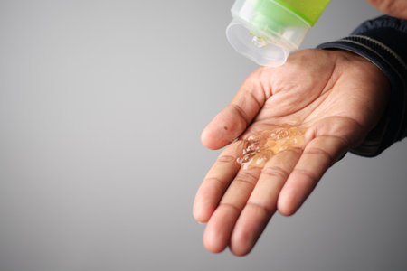 Hand pressing on sanitizer alcohol gel bottle; prevention of virus and bacteria infection; light effect