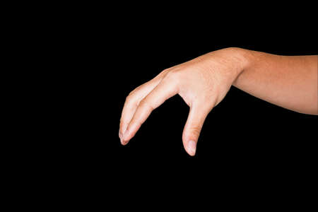 Male hand measuring or holding invisible item, mans palm making gesture while showing small amount of something on black isolated background