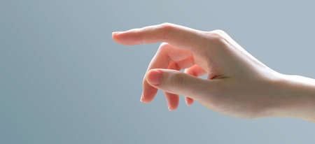 Close-up of hand of a woman making gestures against grey background