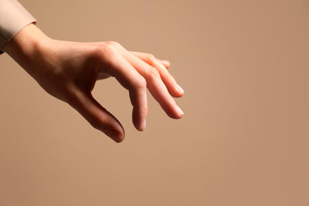 Woman holding something in hand on beige background, closeup. Space for text