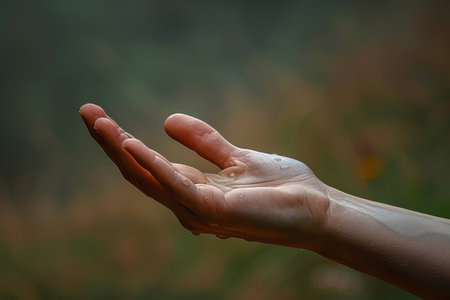Hand, palm and droplet with rain, water and cleaning for sustainability and nature. Person, liquid