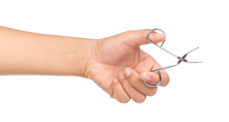 curved forceps with asian hand, isolated on white