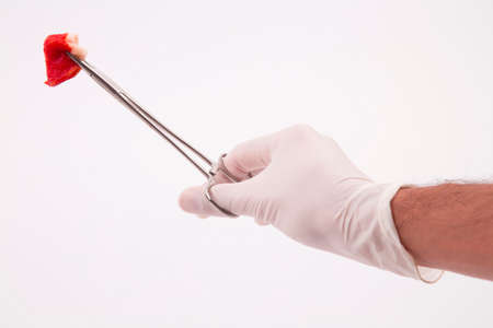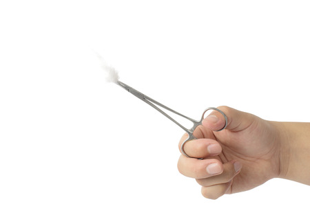Hand with medical gloves holding tooth forceps with alcohol cotton isolated on white background