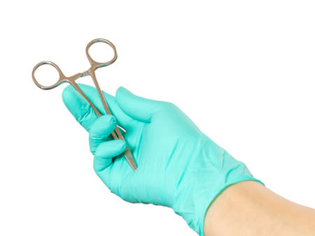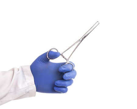 Doctors arm in glove hold hemostatic clamp isolated