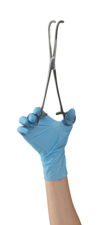 Forceps in doctor hand with disposable glove on white background. Physician holds metallic, silver, steel surgical pincer. Medical equipment of stainless tool for surgery.
