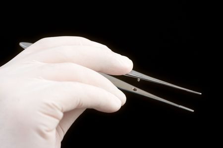 Doctors hand in gloves and holding forceps.