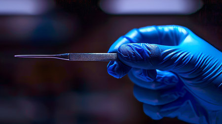 A close-up view of a hand holding a metal tool designed for medical or dental procedures, showcasing precision and professionalism against a soft-focus background.