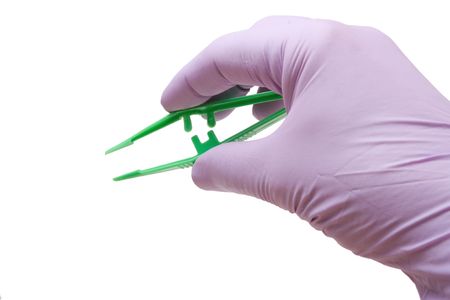 Purple Latex Gloved Male Hand Gesture with green sterile plastic tweezers isolated against white.