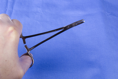 Close up view of female doctor hands that holds forceps.