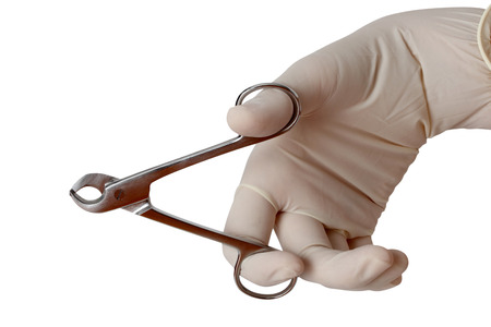 Male hand with surgeon's tool on white background