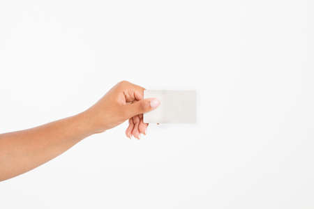 hand hold blank business card. female arm hold paper isolated on white background. copy space. mock up.