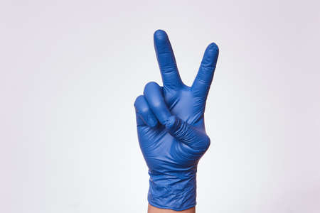 Blue medical glove shows victory sign on blue background. Health protection and defeating the coronavirus pandemic concept.