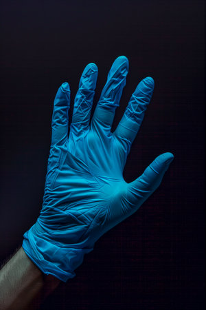 A person wearing a latex glove on their hand with the palm facing up, AI