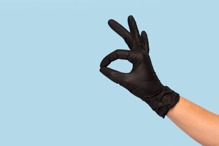 Hygienic hand protection, fine black glove to avoid losing touch in the hands. Hand and finger signs.