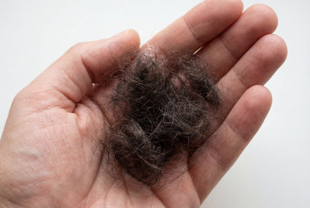 Close up of a hand holding a significant amount of fallen dark hair which symbolizes health issues like stress, alopecia, chemotherapy, or hormonal imbalance.