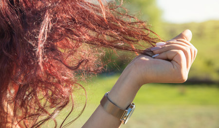 Close-up of an adult woman's hand holding her wet hair. Long brown hair in sunlight. Selective focus.