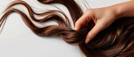 A close-up view of hands gently braiding or styling long, brown hair, capturing the texture and shine of the strands. The image highlights personal grooming, beauty routines, and hair care.
