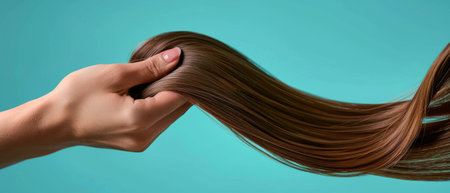A woman's hand delicately holds her long brown hair, showcasing signs of dryness and damage. The mint background adds a fresh touch, emphasizing hair care concerns.
