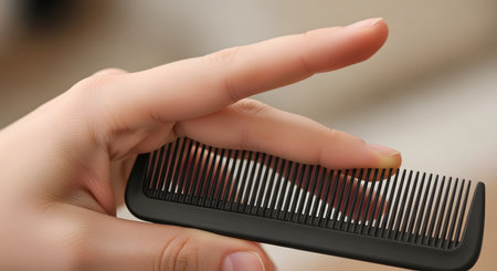 A close-up shot of a hand holding a simple black plastic comb. The fingers are resting over the fine teeth of the comb, illustrating a common grooming tool for hair care and styling.