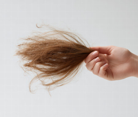 A woman gently holds her long brown hair, focusing on the broken and dry ends against a crisp white background. This highlights common hair care issues beautifully.