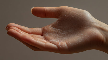 An artistic close-up of an open hand showcases the intricate details of skin texture and soft lines, set against a neutral backdrop for a serene and elegant portrayal of human expression. Perfect for artistic and conceptual visual storytelling.