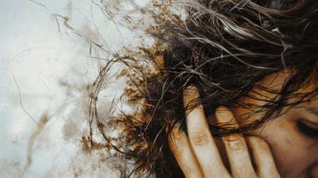 Close-up of a woman head, hands gripping damaged hair, symbolizing the need for hair treatment and care. Copy space available.
