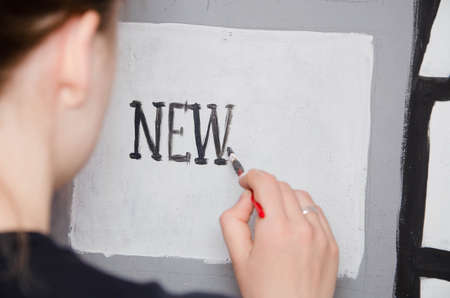 The girl writes with a brush for painting the inscription ,, New ,, on a white square on the wall. Inscription paint on the wall