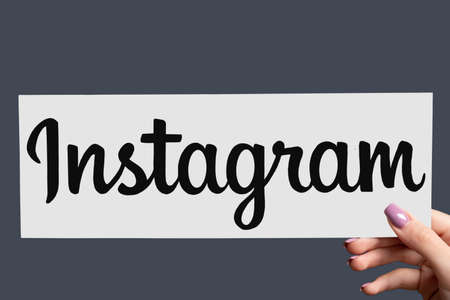 Kharkiv, Ukraine - June 05, 2020: Instagram sign. Social media. Online promotion. Follow network. Female hand showing mobile app icon isolated on purple copy space background.