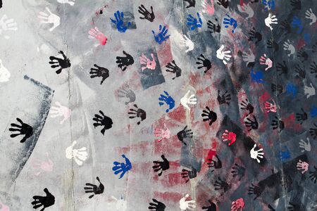 White wall with colorful multicolored hand prints. Friendship concept background. Children hand prints on the wall