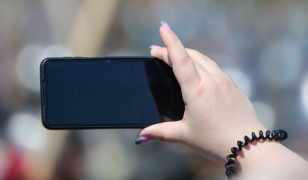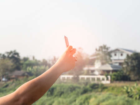 holding a smartphone to take a photo, capturing a shot of nature. Modern mobile device used for photography, video recording, and digital snapshots. Focused on capturing the moment with a smart app,
