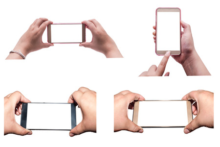 Hand holding smart phone isolated on white background . Smart phone with blank screen and can be add your texts or others on smart phone.Smart phone concept
