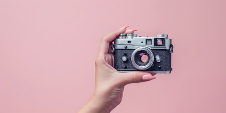 A person is holding a camera with a pink background