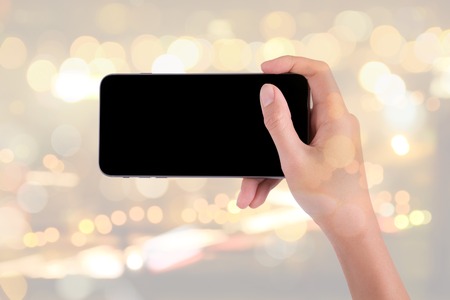 double exposure of woman hand holding the phone tablet and night city bokeh background