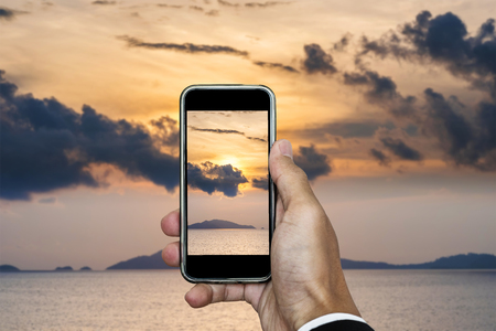 Two hands holding a mobile Smartphone and take a pictureof Sunset on ocean in summer time