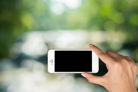 Woman hand hold and smart phone, tablet,cellphone on the forest with green blurred tree nature background. vintage filtered image.