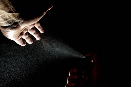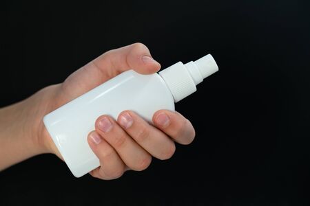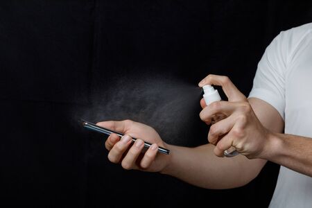 Male hand with a sanitizer spray disinfect his hand in the house on a black background. Covid-19 Coronavirus Quarantine Pandemic. Isolation at home. Protect yourself and your loved ones.