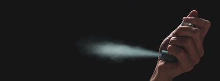 Close-up hand push asthma inhaler with smoke in a male hand for inhalation in respiratory diseases treatment of bronchial asthma, cough, allergies, dyspnea in dark background wide space for banner design