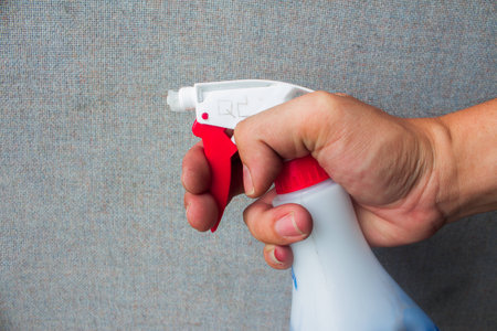 Hand of anonymous person using gloves and a water bottle sprayer against black background.
