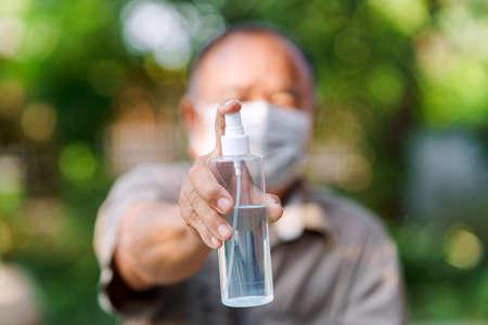 Hand of an old man wearing a mask holding an alcohol spray bottle for stop corona virus outbreak. Wuhan coronavirus and epidemic virus symptoms. Hygiene concept.