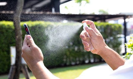 Men use alcohol spray to get rid of bacteria and viruses on mobile phones, Inhibition and prevention of Covid-19 virus infection using 70 percent alcohol, protect virus concept.