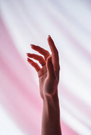 A persons hand with a white shirt and pink background, AI