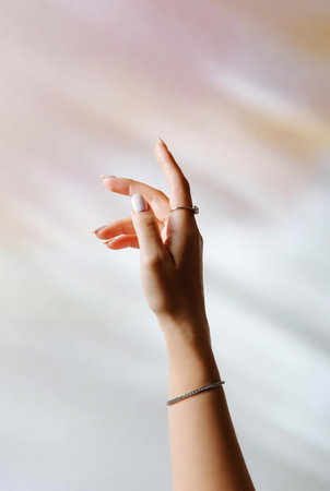 A close up view of a woman s hand in a serene contemplative gesture The palm faces upward with fingers slightly curled adorned with delicate rings The image is captured with a macro for exceptional
