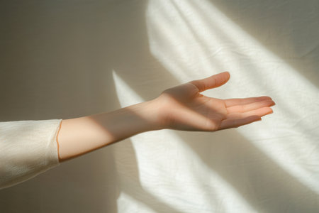 A detailed close-up shot of a persons open hand, palm facing forward, with fingers slightly spread. The hand is illuminated by soft, natural light coming from a window on the left, creating subtle shadows and highlights. The background is blurred, suggesting an indoor environment.