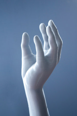 Three-dimensional object printed on 3D printer. Abstract interior model human hand with fingers created on 3d printer. Concept FDM 3D Printing technologies. Additive modern new progressive technology