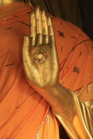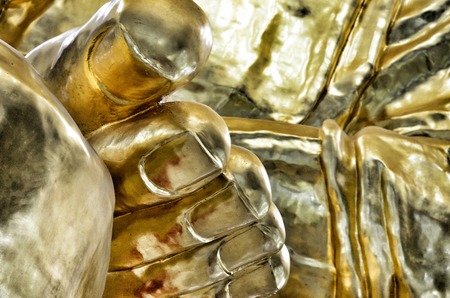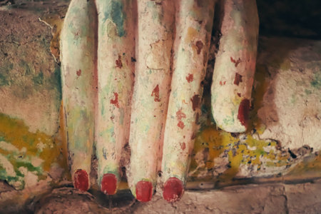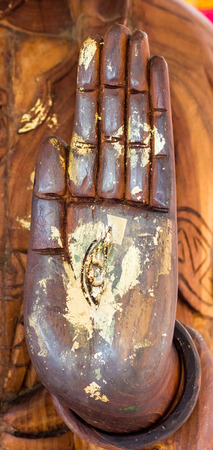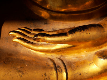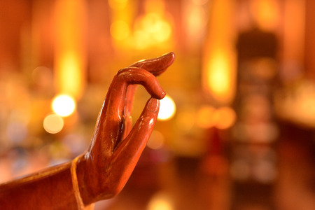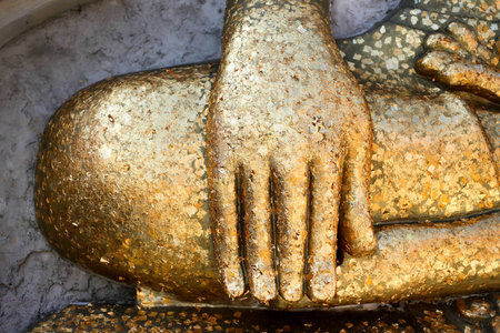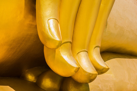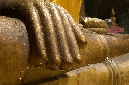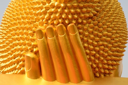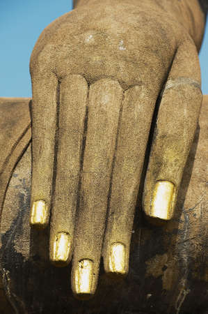 Closeup of the hand of Lord Buddha with gold leaf applied on finger nail.