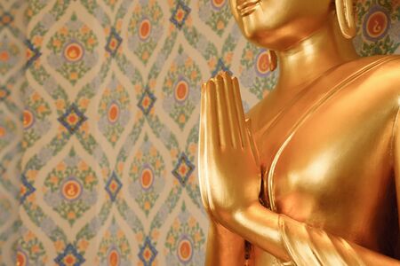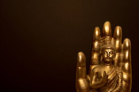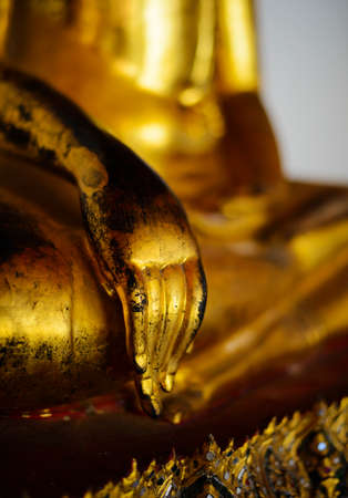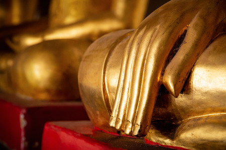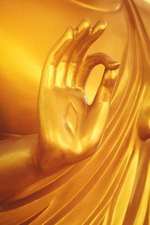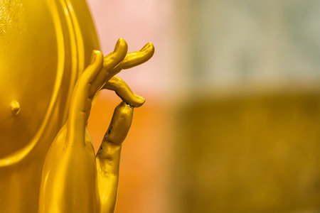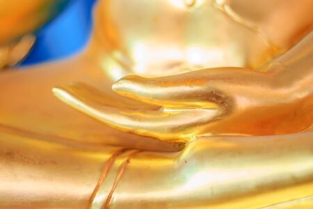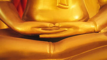 Close focus on fingers and hand of golden Buddha image as meditation posture represents highly concentration.
