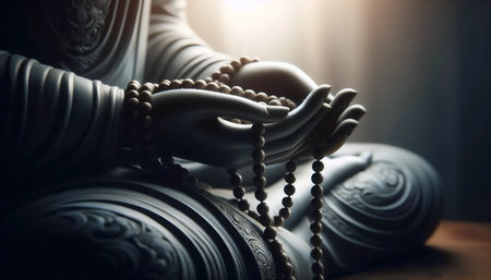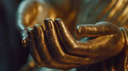 Detailed close-up of Buddha hands in meditation pose, soft background with copy space for mindfulness concept